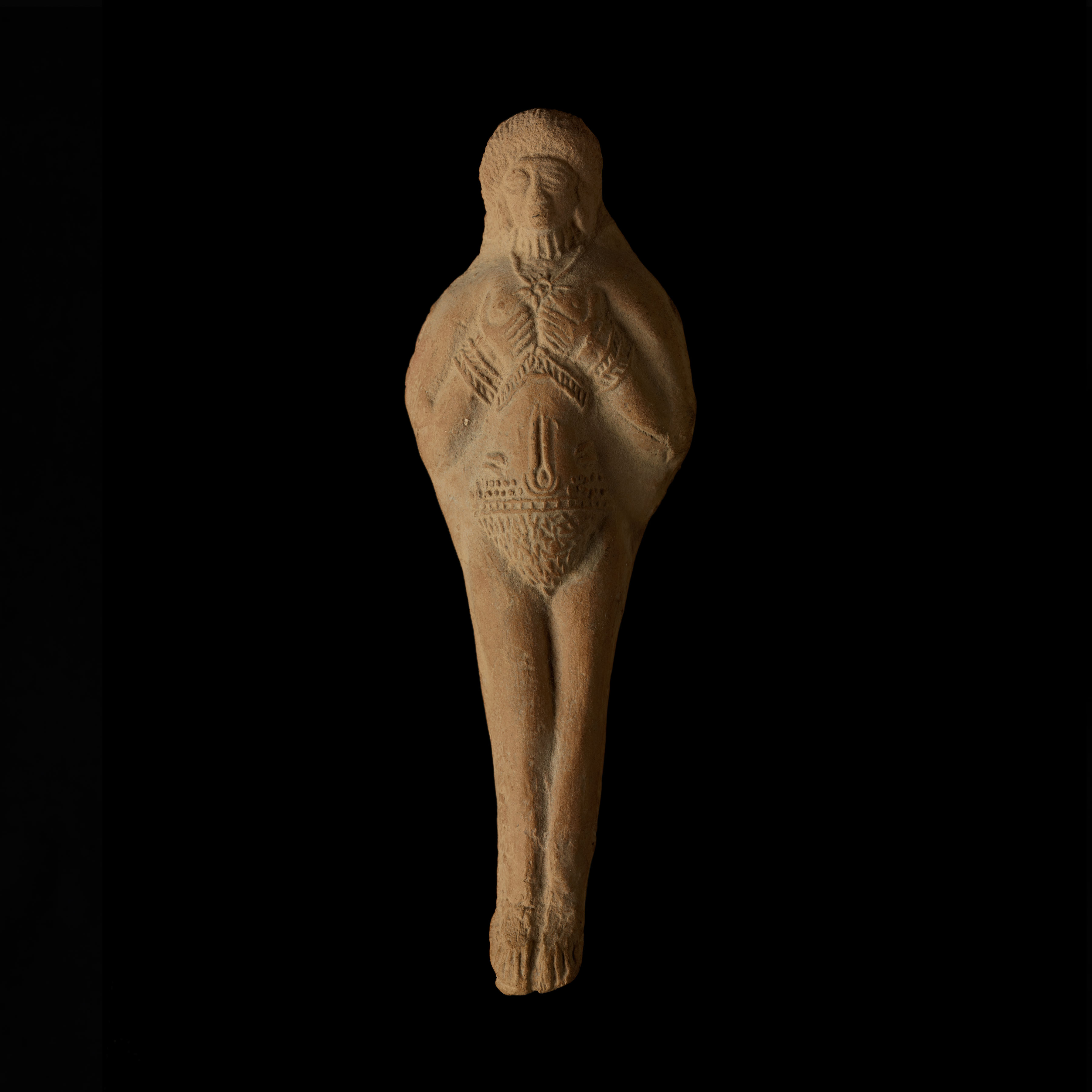 Buff terracotta, molded in the form of a standing female with her hands cupping her breasts, wearing large earrings, heavy bracelets, and diadems, a broad torque with geometric pattern, and a necklace with large eight-pointed star pendant