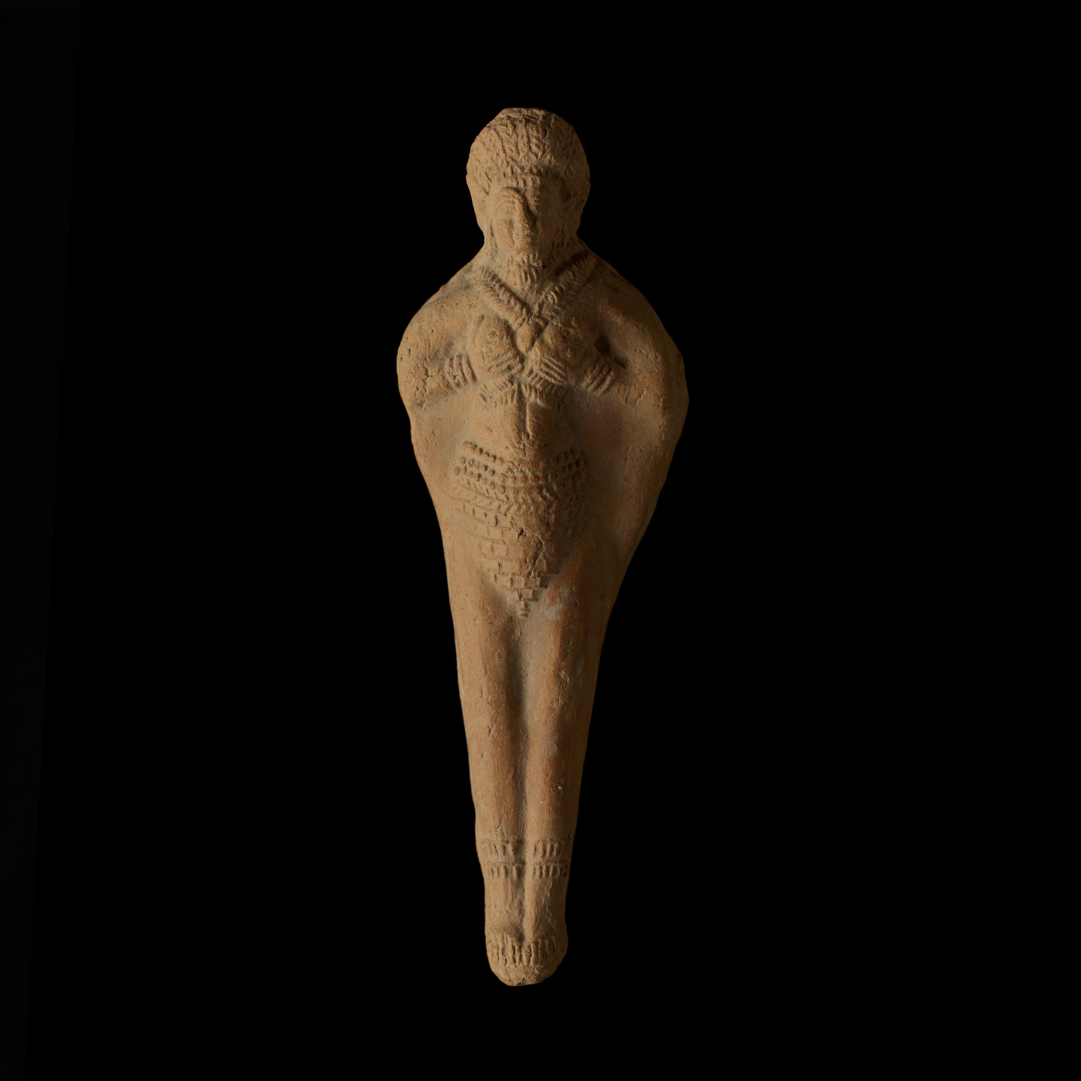 Buff terracotta, molded in the form of a standing female with her hands cupping her breasts, wearing large earrings, heavy bracelets, diadems and heavy necklaces and anklets, with ringbone shoulder-straps crossing through a ring between her breasts, wearing anklets and a double-rod torque with a geometric pattern