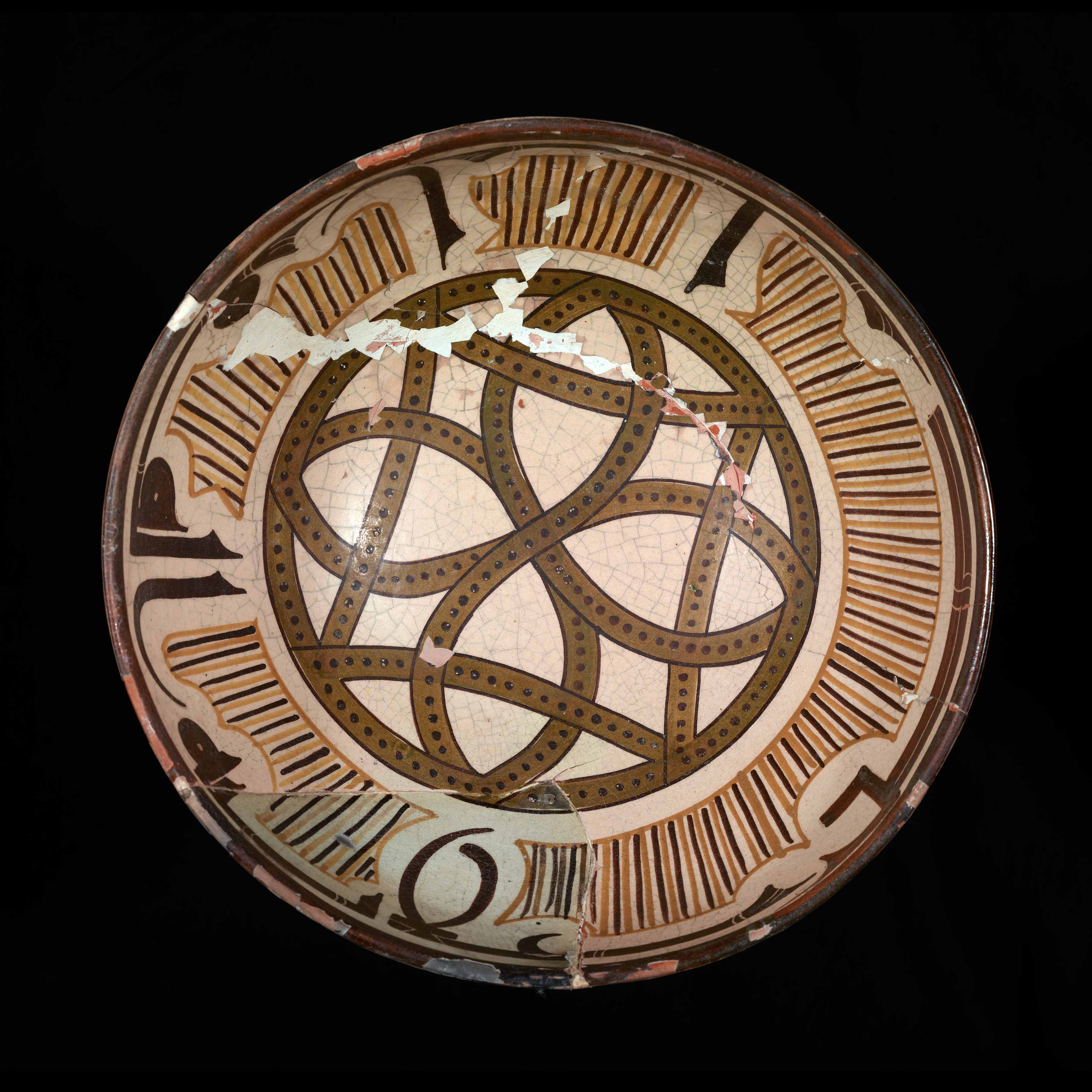 Earthenware, cream slip decorated in golden brown, dark brown,