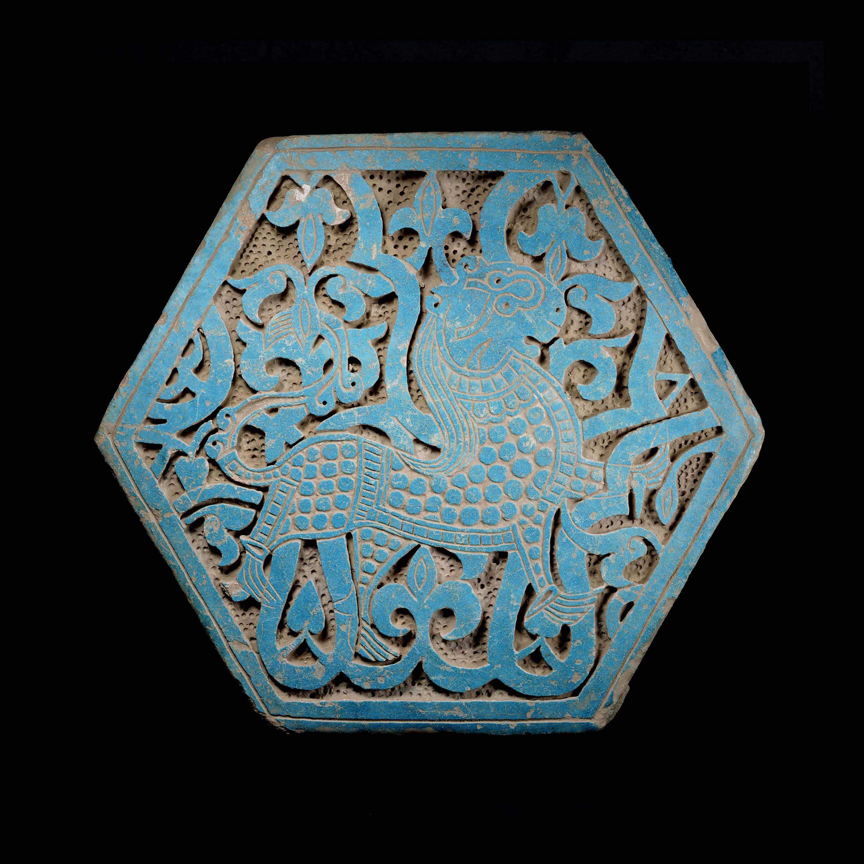TURQUOISE-GLAZED HEXAGONAL TILE WITH CHEETAH AND FOLIATED AND STYLIZED WORD, AL 'ALA (THE MOST HIGH), SET AGAINST A DEEPLY RECESSED UNGLAZED, STIPPLED BACKGROUND