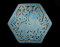 TURQUOISE-GLAZED HEXAGONAL TILE WITH CHEETAH AND FOLIATED AND STYLIZED WORD, AL 'ALA (THE MOST HIGH), SET AGAINST A DEEPLY RECESSED UNGLAZED, STIPPLED BACKGROUND